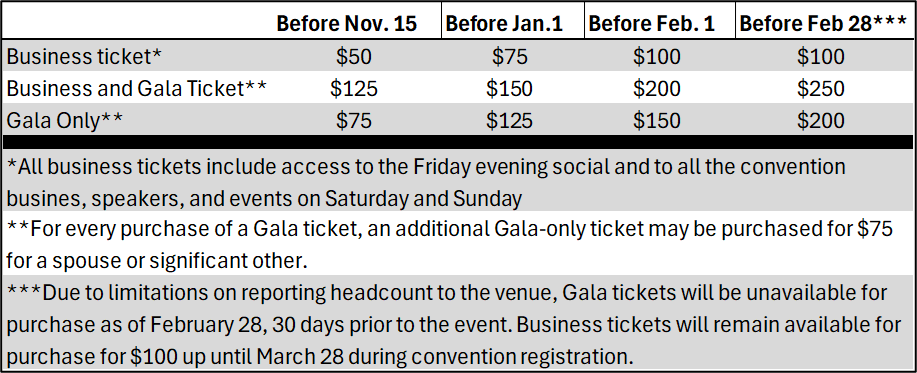 Business tickets will remain available for purchase up until registration for convention closes the morning of Saturday, March 28, 2026. Those tickets will be $100 if purchased anytime in March.