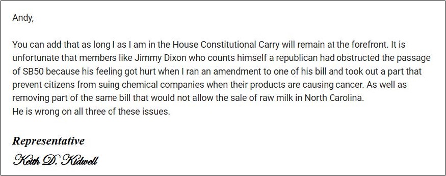 In the meantime, get active with your legislators. Call them, email them, visit their office in Raleigh, or catch them at an event locally. Let them know you demand they pass a constitutional carry bill. Yes, SB50 is not the “perfect” bill, but it is as good a bill as we can expect to get with the current crop of legislators. Once the statute is in place, it can always be incrementally improved.